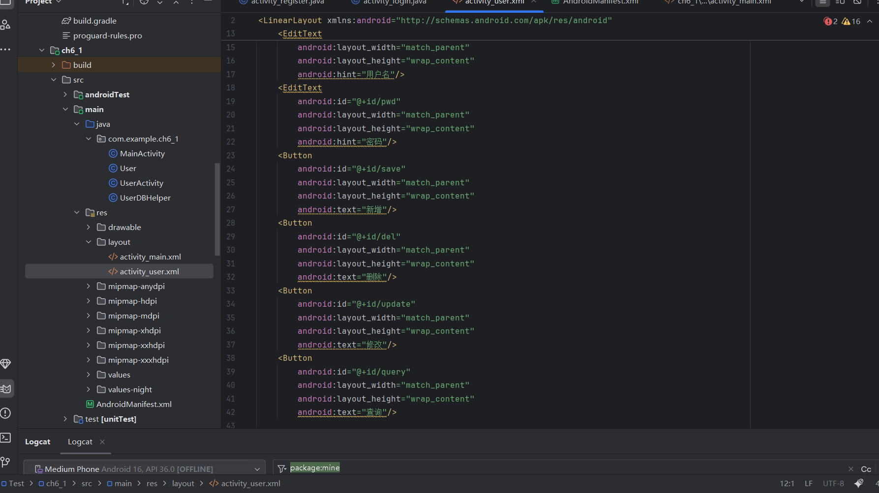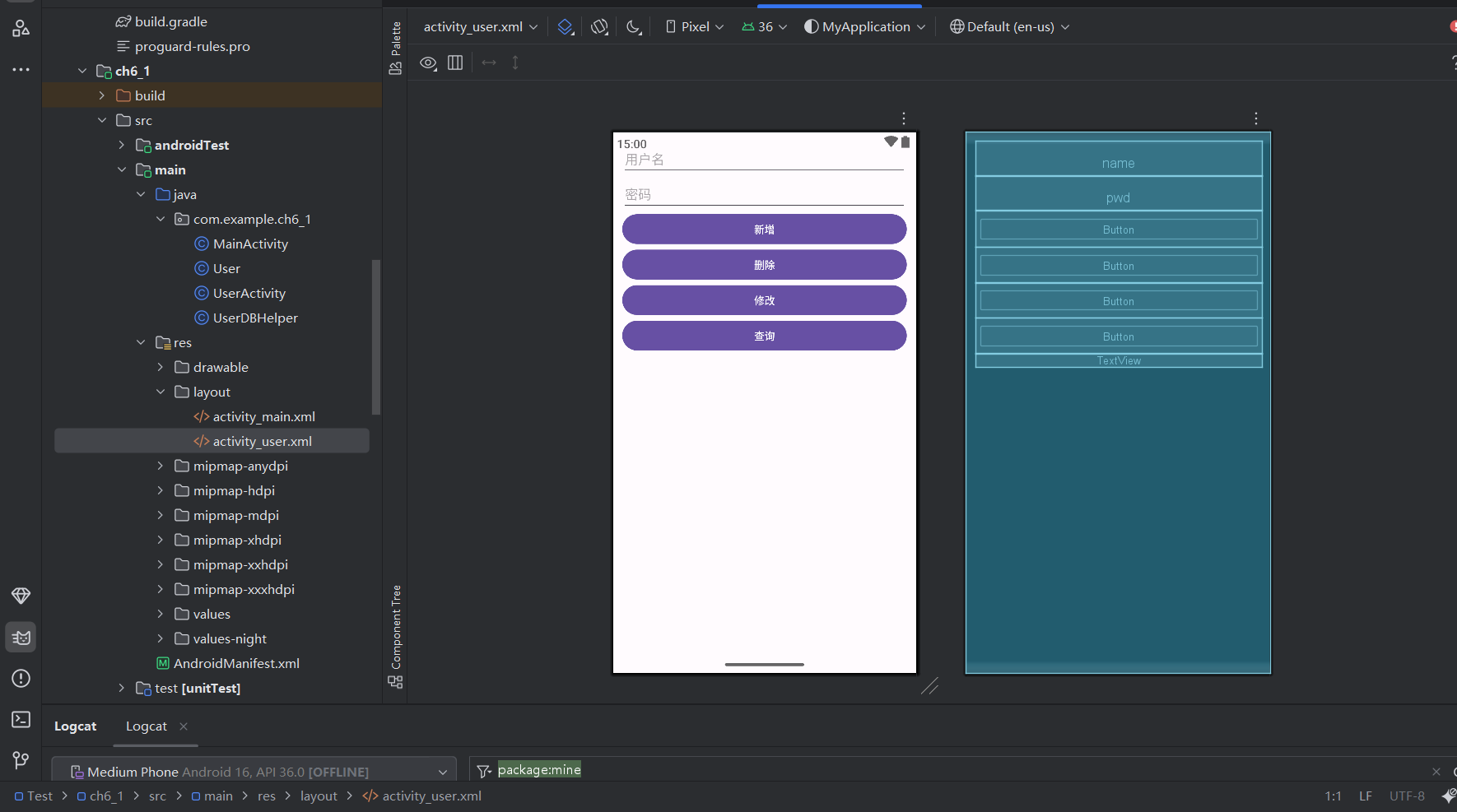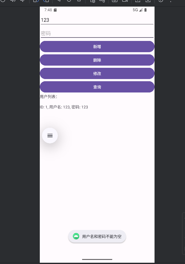 采用垂直LinearLayout布局,包含两个输入框(用户名、密码)、四个功能按钮(新增、删除、修改、查询)和一个文本框(显示用户列表),布局简洁直观。