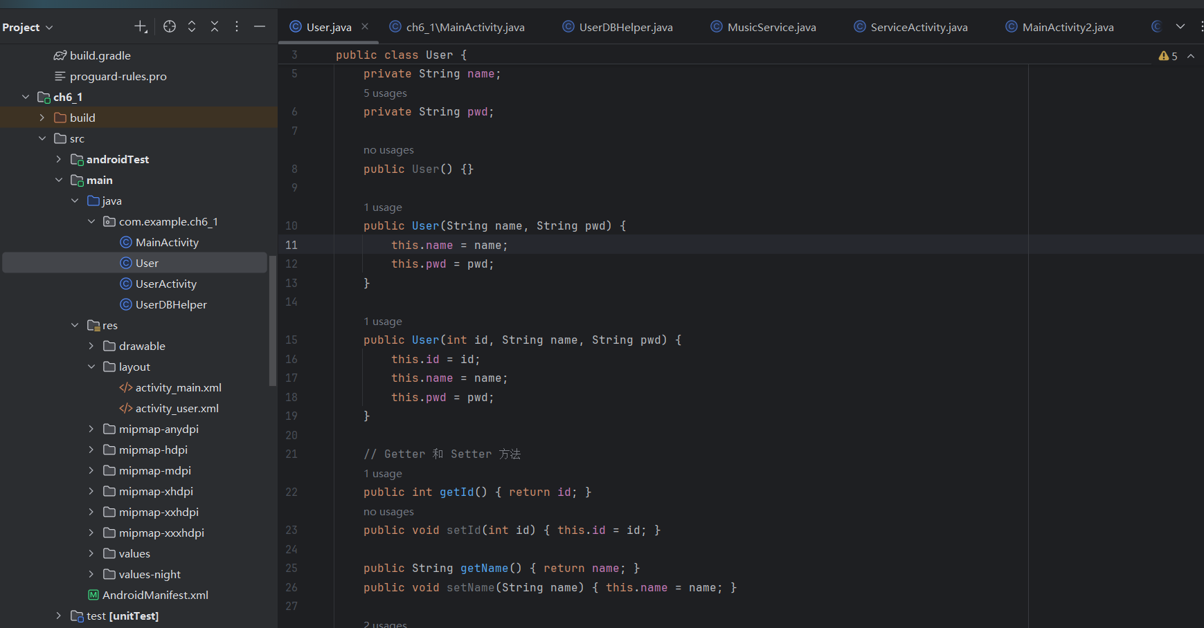 ├── User.java // 实体类:封装用户数据(id、name、pwd)