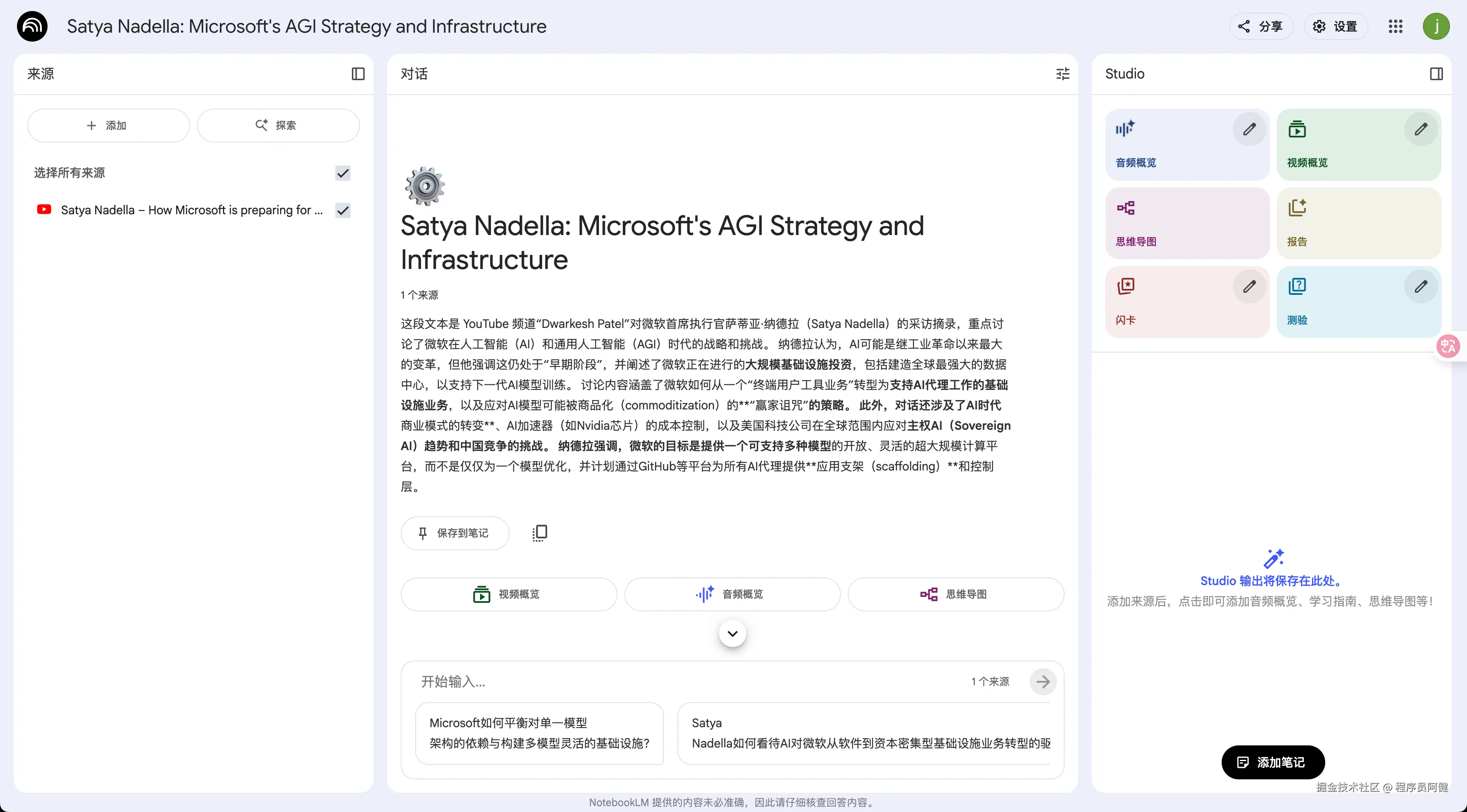 只需要把 YouTube 视频链接粘贴到 NotebookLM,它就能自动生成课程提纲、思维导图、报告等多种内容形式,然后还可以和视频内容进行对话和提问。
