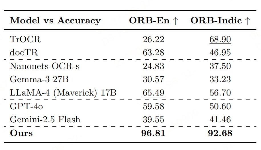 训练数据:英文数据集(11K文档图像,含发票、合同等真实场景);11种印度语言数据集(38K图像,源自Wikisource