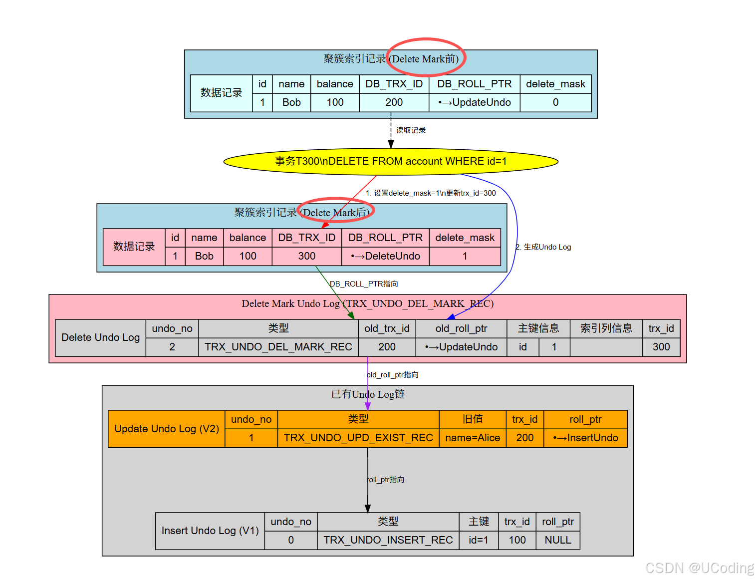- 所以,delete的undo log只需要考虑阶段1 的回滚