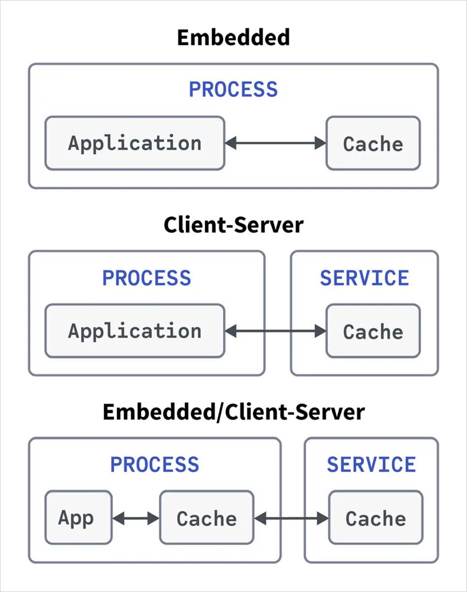 嵌入式/客户端-服务器 -- 这是一种混合模式,整个缓存托管在不同的服务上,但客户端在同一进程中拥有一个较小的本地缓存。