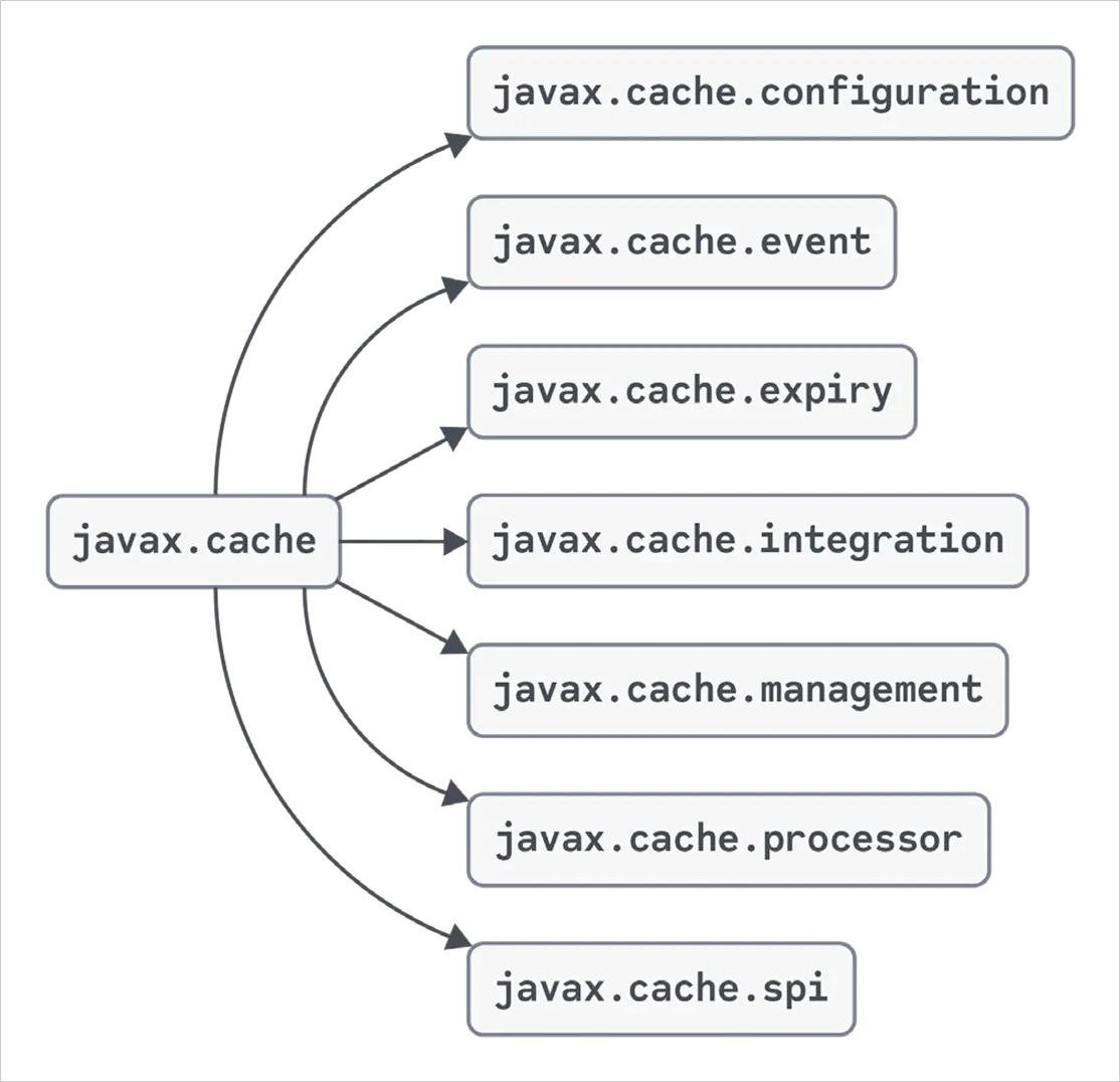 通用管理(CacheManager)和与缓存交互(Cache)的设施位于 javax.cache 包内。除了初始配置之外,除非您想为缓存添加额外功能,否则仅使用此包中的类型就可以完成很多工作。例如,"JCache 精要"部分介绍中的示例用法主要使用了 javax.cache 中定义的接口。