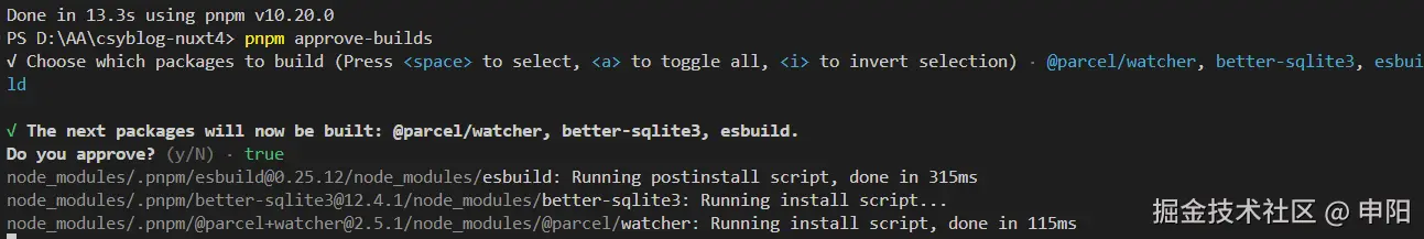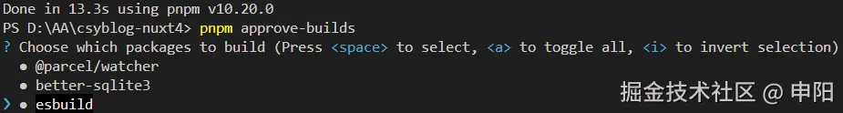 根据提示,我尝试了一下执行pnpm approve-builds, 并且勾选上以下依赖