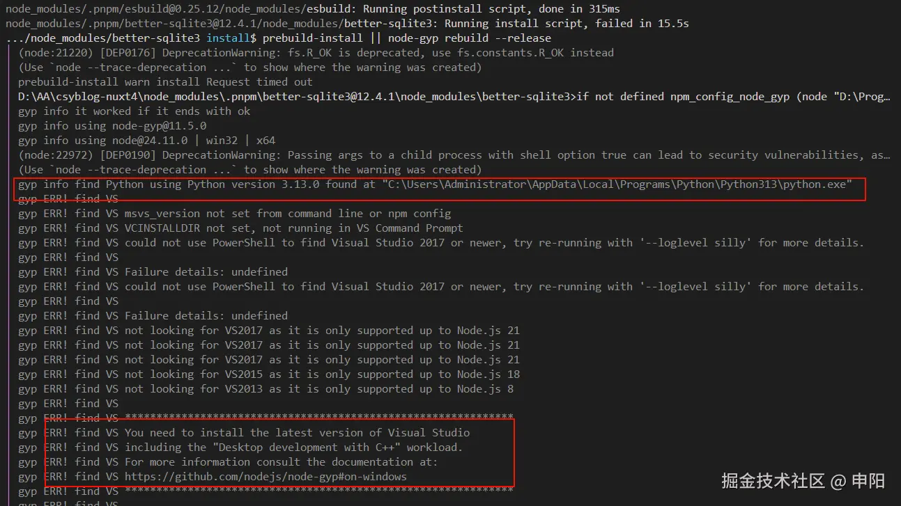 大致意思是说,它需要依赖我本地的 Visual Studio 来进行编译,还和 c++有点关系,说巧不巧,我前几天刚把这玩意卸载了,之前学习c#的时候装过。我肯定不会再装回去了,这有点反直觉了,难道我用这个还得为你装个本地的编译器嘛。我都懒得去试这个解决方案,我觉得很不合理。