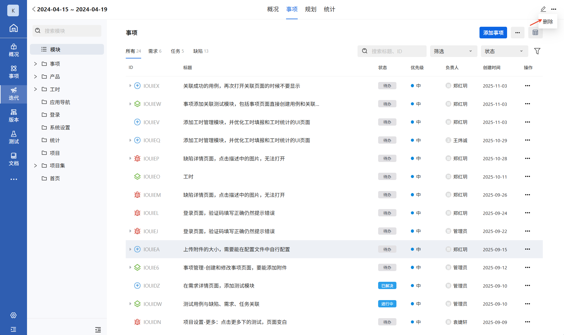 点击迭代列表或者迭代详情页面的更多 ->删除按钮,删除迭代