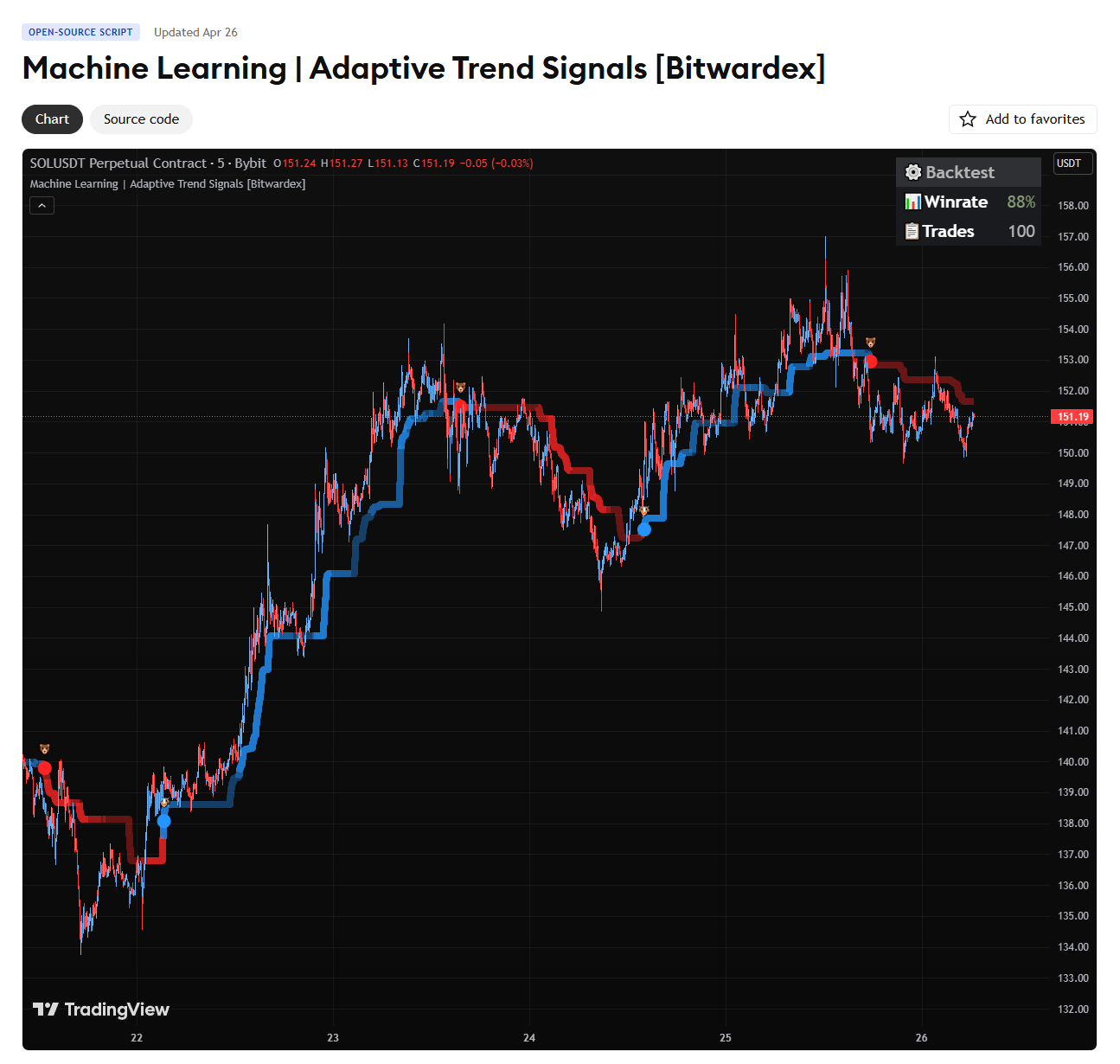 策略应用场景:策略指标"Machine Learning | Adaptive Trend Signals [Bitwardex]"被直接叠加在5分钟图上,信号点(蓝色看涨和红色看跌)也是基于5分钟K线生成的。
