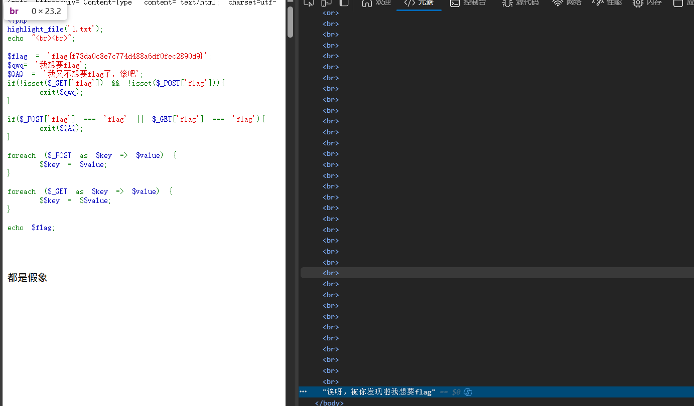 这一题考察变量覆盖,题目给的flag是假的,并且必须要传入一个flag变量,否则会执行exit($qwq),这是使用的是&&,与就是说get和post至少有一个flag参数的传参就会绕过exit语句,这里先用get举例,这里传入?flag=qwq,
