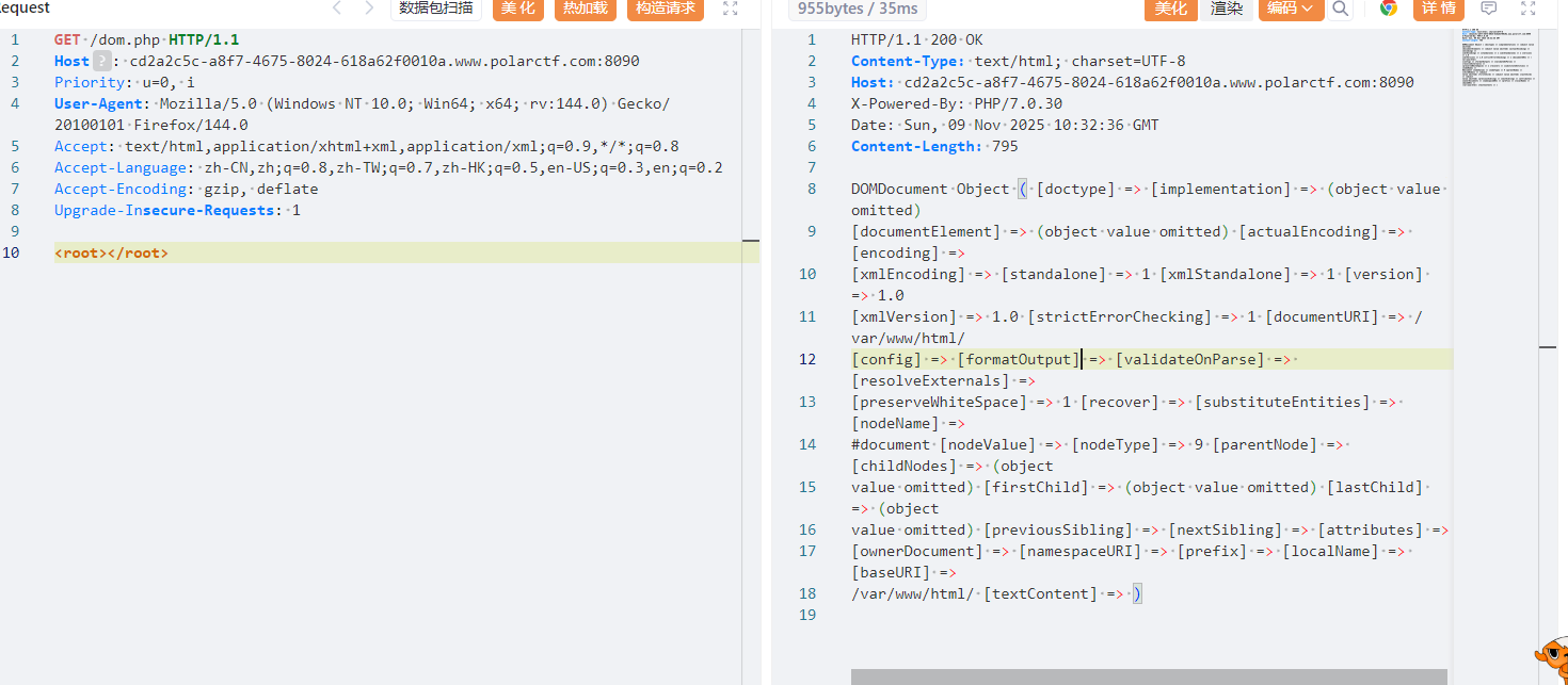根据题目提示就是考察xxe了,题目给了phpinfo,然后就没啥能干的了,dirsearch扫一下有个dom.php可以访问,得到报错信息