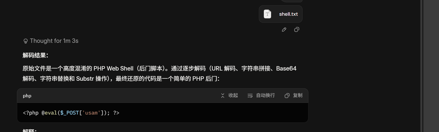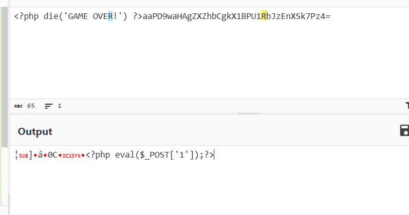 在base64解码过程中,\<\>?""这些符号无法被解码所以会直接绕过,解码的只有phpexit这7个字符,所以在content中衔接一个a,构成8个字符,base64在解码的时候,是4个字节转化为3个字节,又因为死亡代码只有phpexit着7个字节参与了解码,所以补上一位就可以完全转化,转换后死亡代码就是乱码,而后面的代码解码后就是木马。