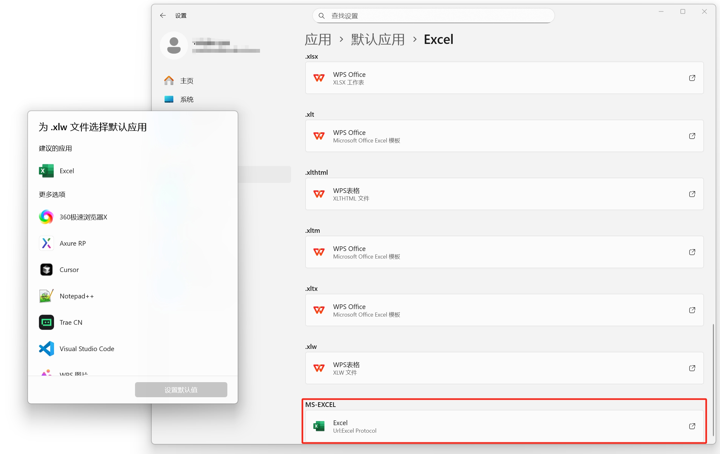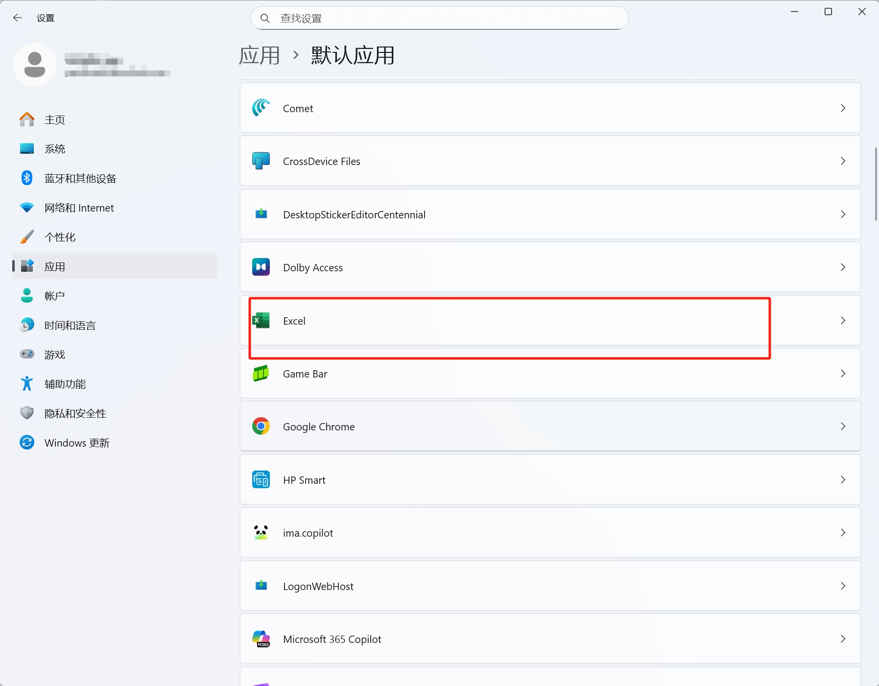 win11操作系统 找到默认应用。找到EXCEL进入,除了最后一个不用管其他后缀EXCEL的 默认应用都设置为wps。