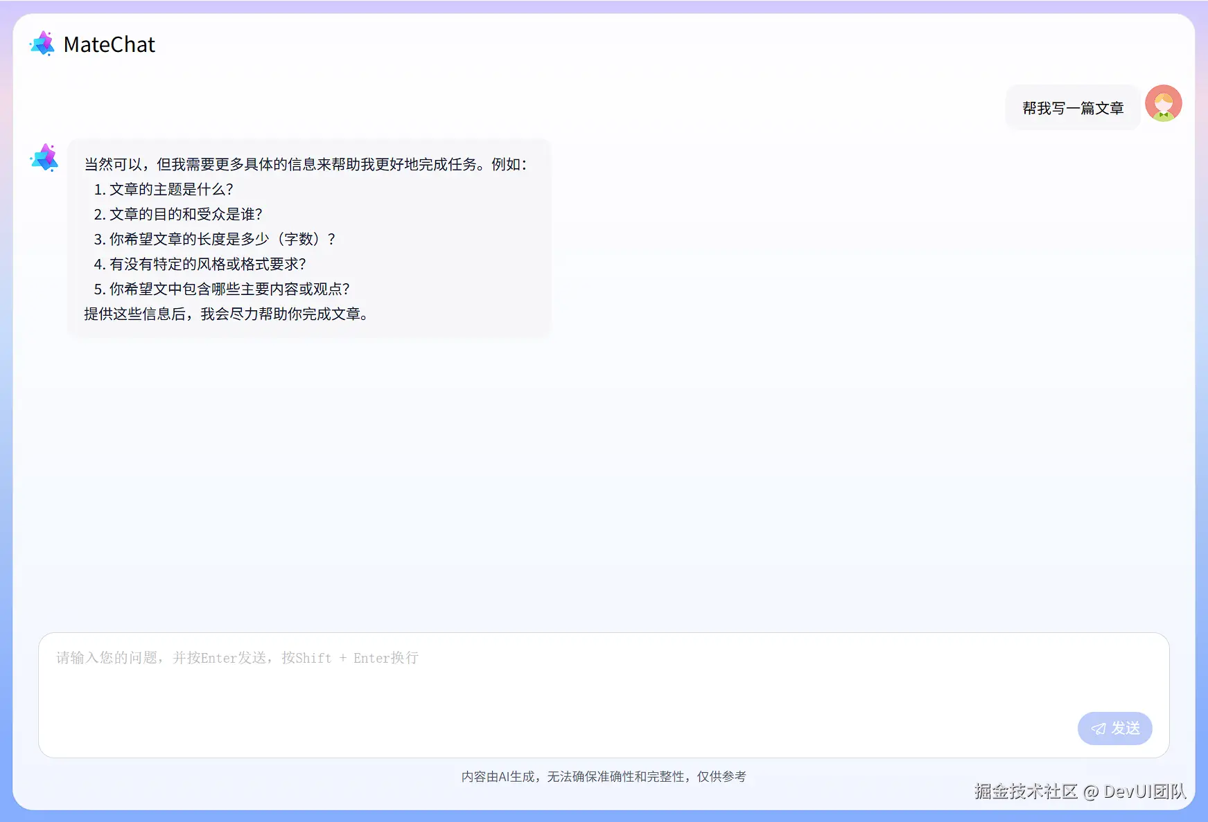 参数上述代码,此处你已经可以搭起一个基础的智能对话界面了,如果你需要更多丰富的主题样式,或者对接真实大模型,可以参考第 4、5 点进行使用。