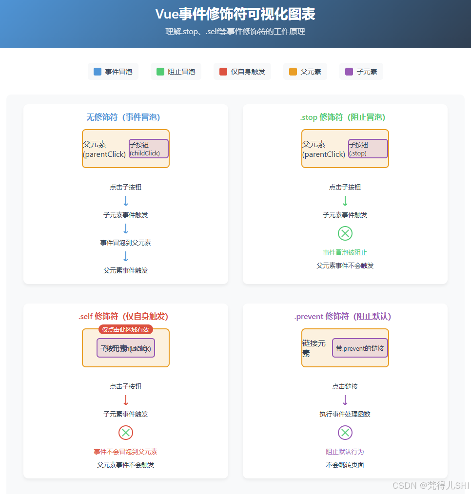 在实际开发中,我们常需要 "阻止事件冒泡" 或 "阻止默认行为"(如阻止表单提交刷新页面)。Vue 提供了事件修饰符,无需手动操作 event 对象,让代码更简洁。