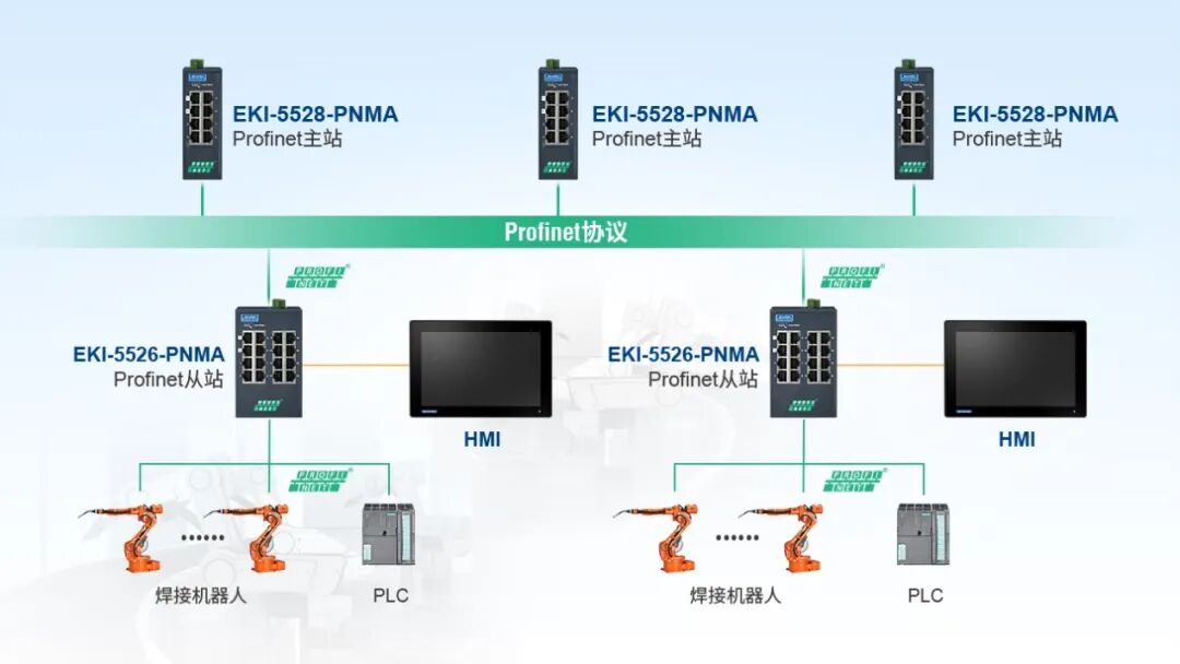 在焊接工艺产线,研华以EKI-5528-PNMA为主站的网络架构,作为整个系统的 "核心大脑",负责调度与监控所有设备的实时通信;各工位则配置 EKI-5526I-PN 和 EKI-5528I-PN 从站交换机,连接焊接机器人、HMI 及 PLC 等终端设备,构建高效的数据交互网络。主从协同的结构形成了稳定可靠的 "神经网络",确保指令精准下发与数据实时反馈,并通过光纤接口型号满足环网冗余与远距离传输需求,全面提升系统稳定性与灵活性。