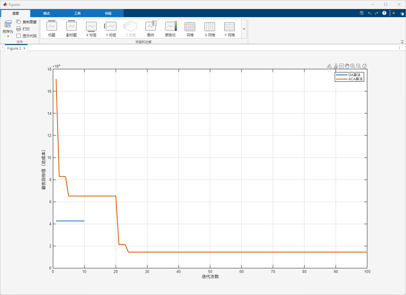 图2 风光储并网微电网容量优化中GA与ACA算法收敛曲线