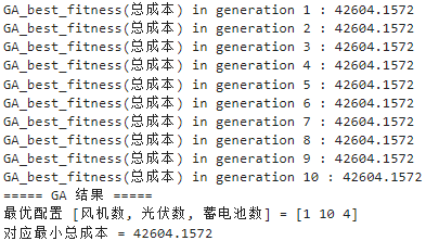 图3 GA算法求得的最优容量配置及其总成本输出结果