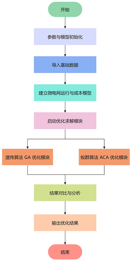 仿真结果表明,两种算法均能有效降低系统总成本,其中遗传算法在收敛速度方面具有优势,而蚁群算法在全局寻优能力和解的稳定性方面表现更优。研究结果验证了采用智能优化算法进行风光储并网微电网容量优化的可行性与有效性,为微电网规划与可再生能源系统设计提供了有益参考。