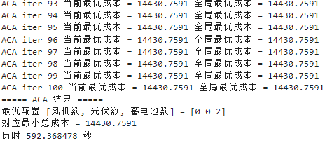 图4 ACA算法求得的最优容量配置及其总成本输出结果