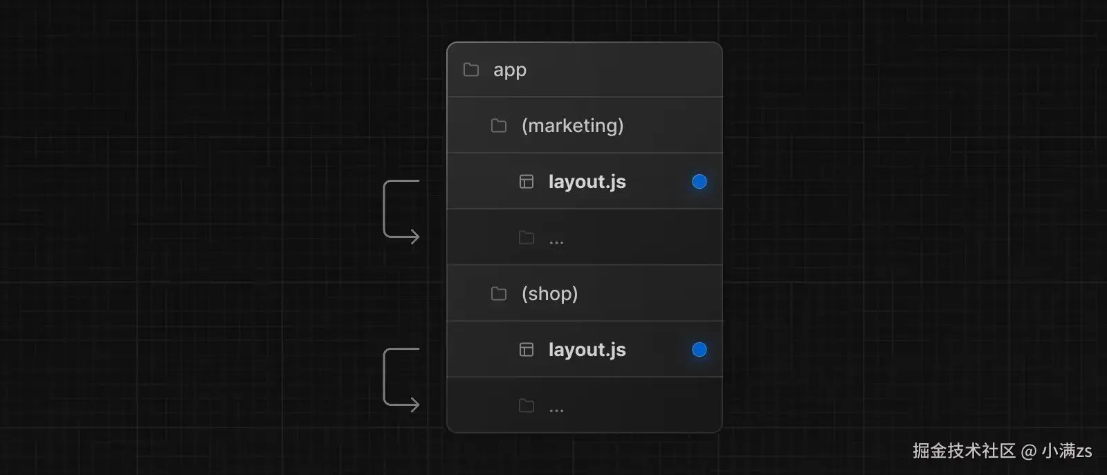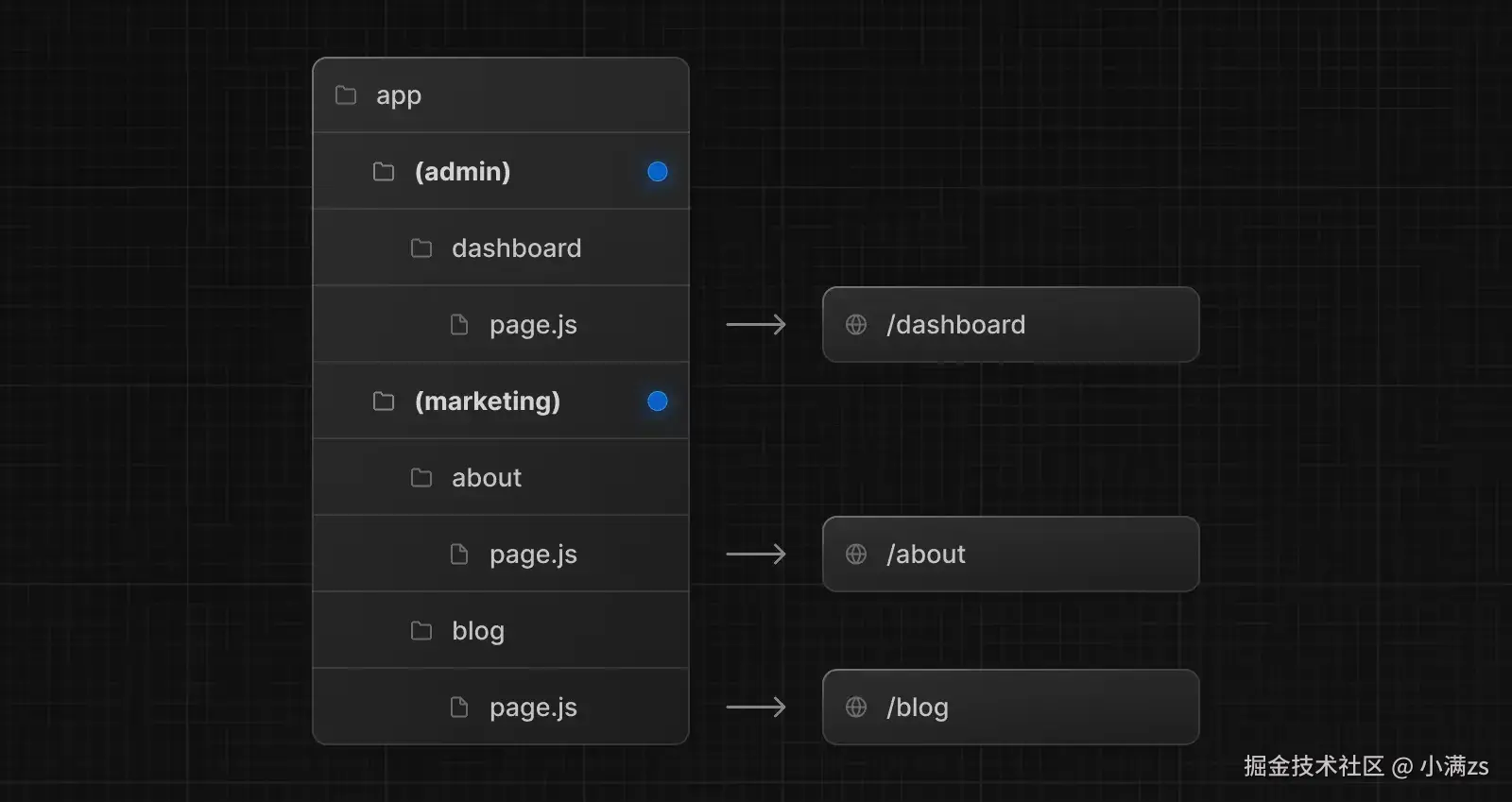 路由组也是一种基于文件夹的约定范式,可以让我们开发者,按类别或者团队组织路由模块,并且不影响 URL 路径。