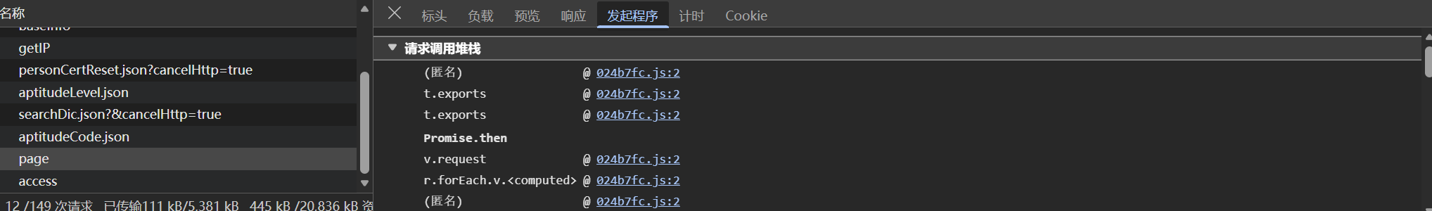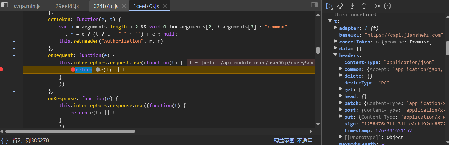前面两个导出函数不用管它。点击Promise.then后面的第一个函数链接,进入到发送请求的函数里,打上断点并刷新页面: