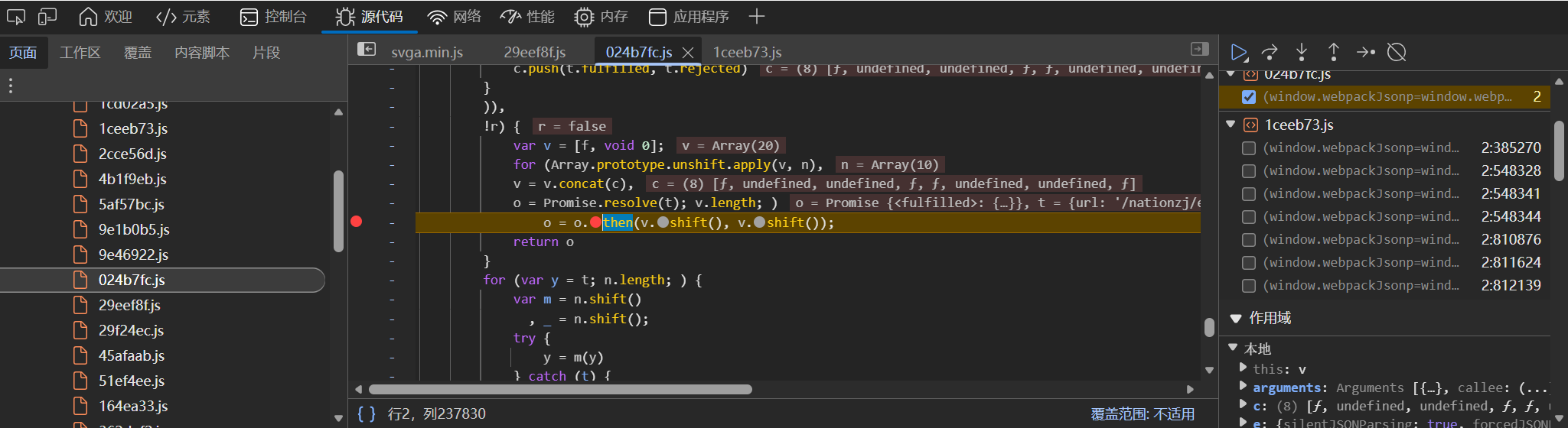 基本可以确定所需要的函数就在v里面了。找出v数组里面对应方法的函数体打上断点(注意函数名包含request 关键字,包含response 的是响应与数据生成无关)。去掉之前在调用then时的断点,重新加载页面并不断调试断点,最终出现两个变量时停在图中的页面: