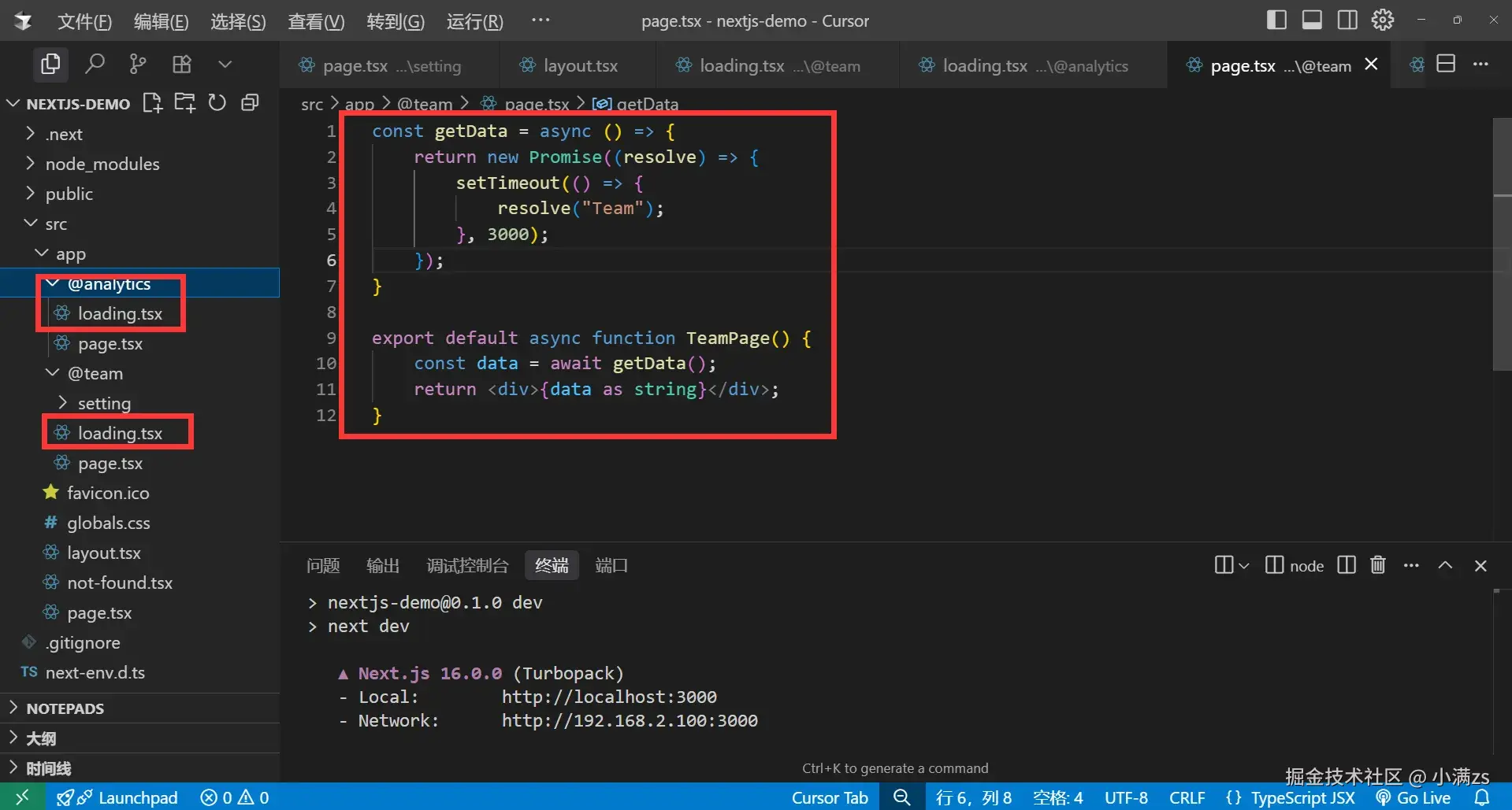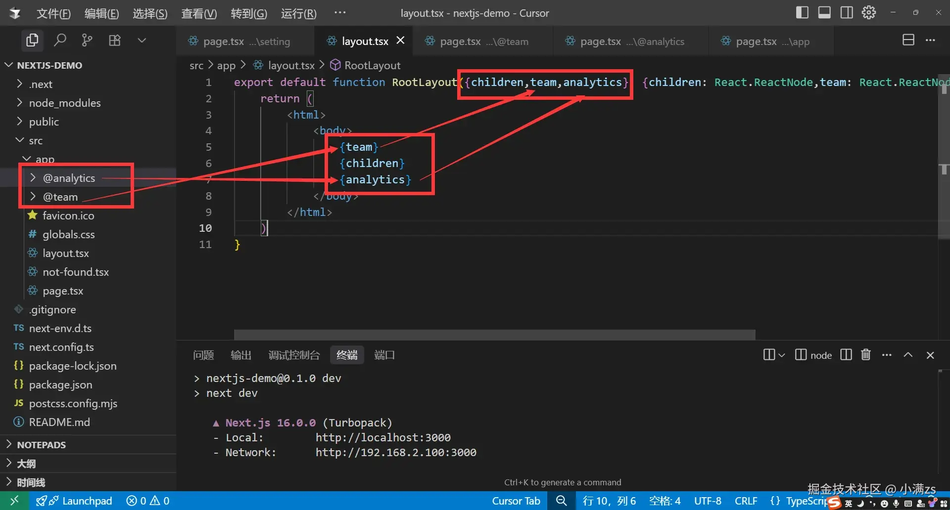 定义完成之后,我们就可以在layout.tsx中使用team和analytics来渲染对应的页面,他会自动注入layout的props里面