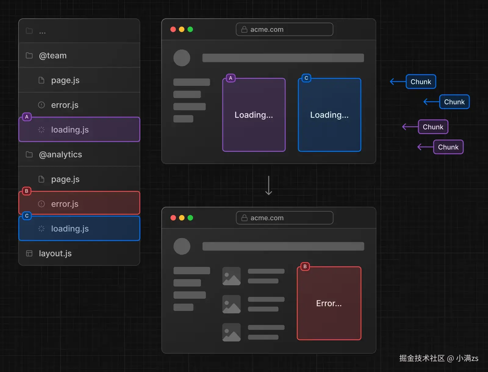 当我们使用了平行路由之后,我们为其单独定义loading,error,等组件使其拥有独立加载和错误处理的能力。