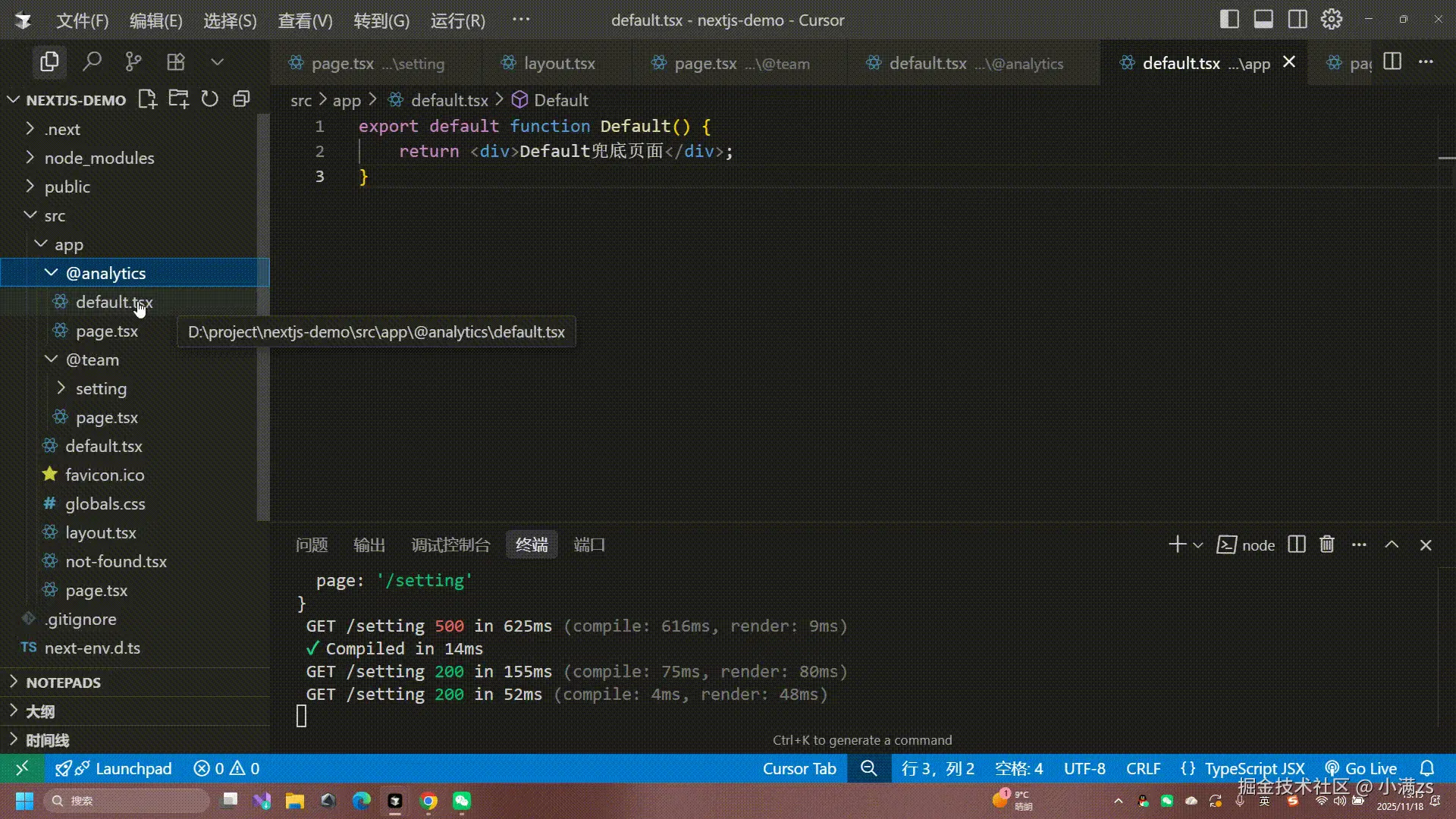 平行路由指的是在同一布局layout.tsx中,可以同时渲染多个页面,例如team,analytics等,这个东西跟vue的router-view类似。