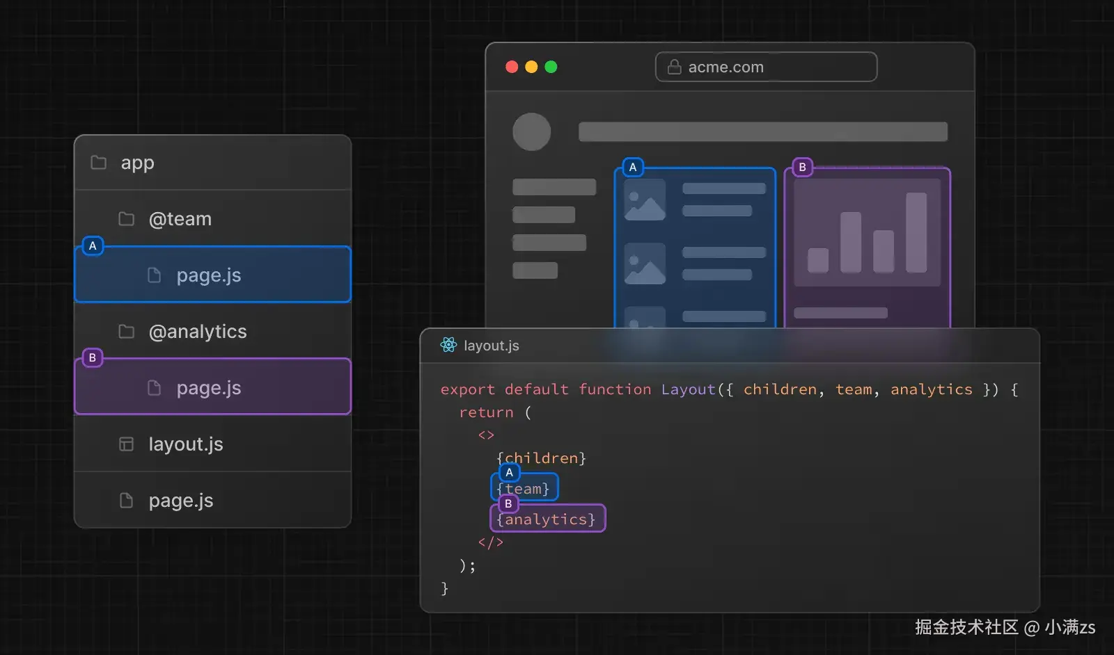 平行路由的使用方法就是通过@ + 文件夹名来定义,例如@team,@analytics等,名字可以自定义。