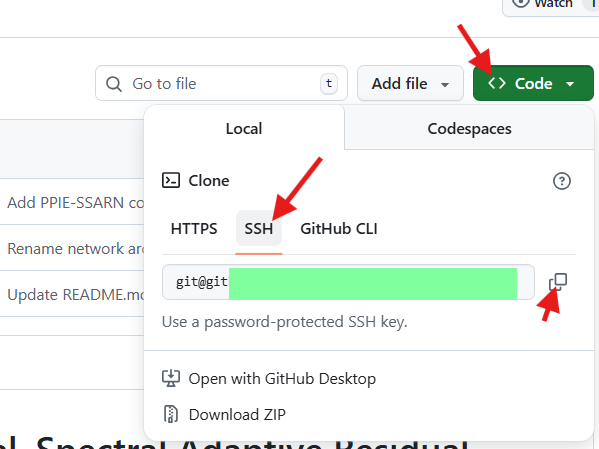 进入想复现的项目主页,【Code】→【SSH】,即可克隆。