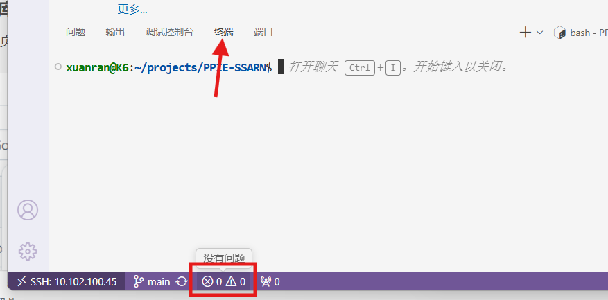 - 如何打开终端:软件下面的报错提示处点一下(下图方框中),然后窗口选择"终端"(箭头处)。