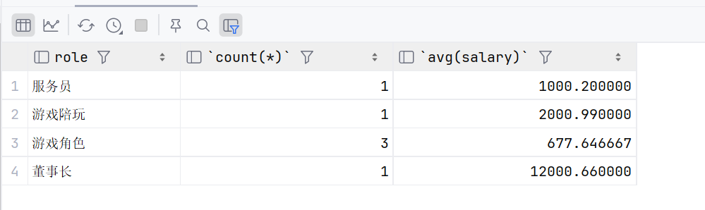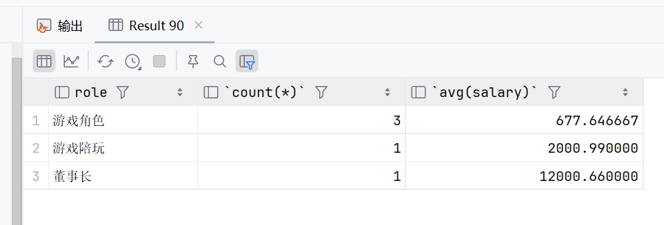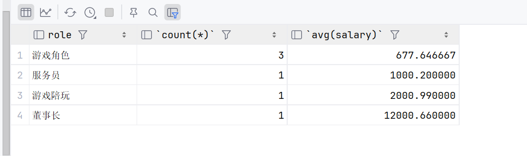 select role,count(*),avg(salary) from emp where name!= '马云' group by role order by avg(salary);