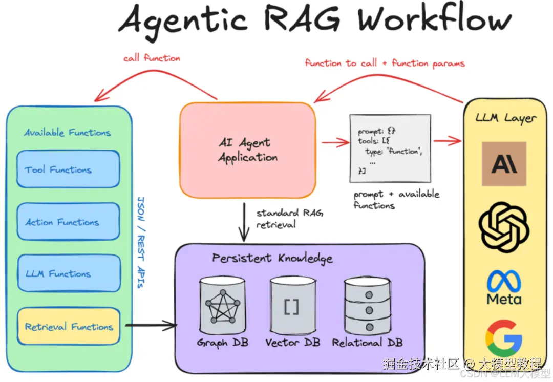 Agentic RAG 在传统RAG流程的基础上加入了一个重要角色------Agent(智能体) 。它不仅能检索,还能根据任务动态选择工具、拆解问题、调用外部API,甚至多轮迭代优化结果。这意味着它可以: