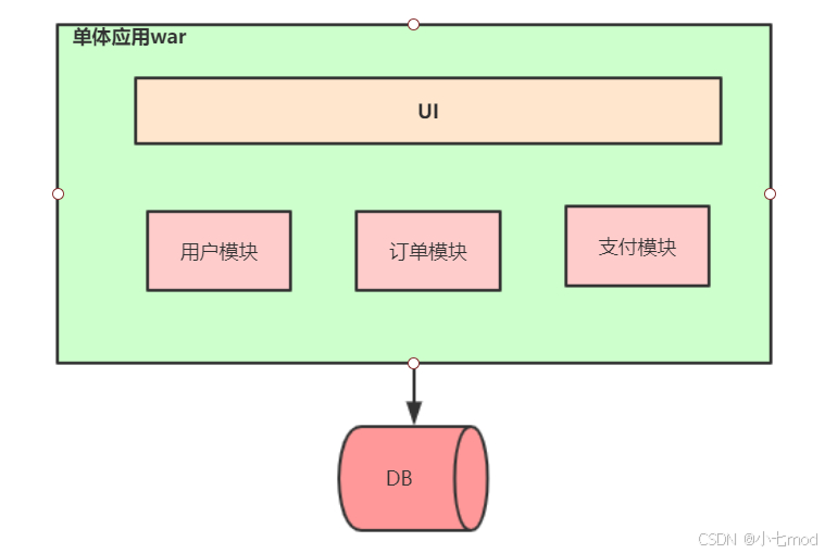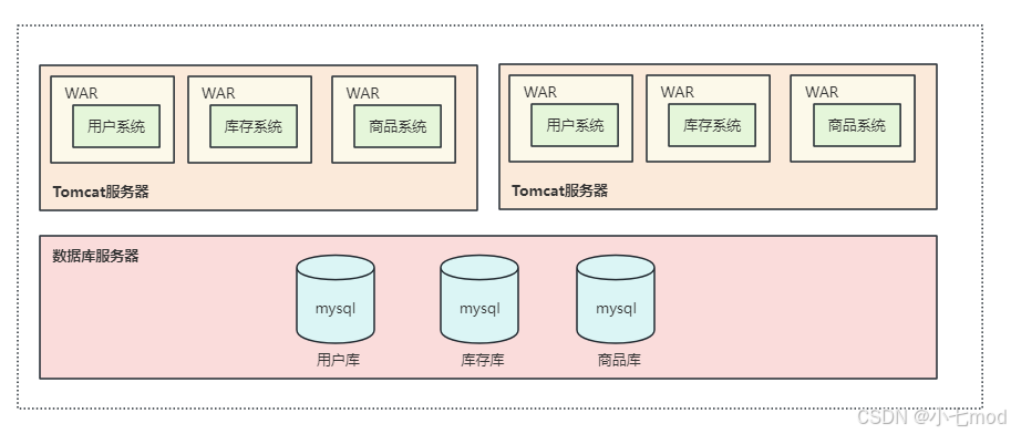 互联网早期,一般的网站应用流量较小,只需一个应用,将所有功能代码都部署在一起就可以,这样可以减少开发、部署和维护的成本。比如说一个电商系统,里面会包含很多用户管理,商品管理,订单管理,物流管理等等很多模块,我们会把它们做成一个web项目,然后部署到一台tomcat服务器上。