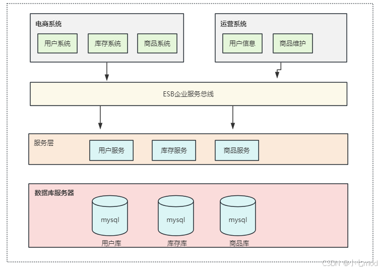 基于这些问题,就引入了SOA(Service-Oriented Architecture),也就是面向服务的架构。在SOA中,会采用ESB(企业服务总线)来作为系统和服务之间的通信桥梁,ESB本身还提供服务地址的管理、不同系统之间的协议转化和数据格式转化等。调用端不需要关心目标服务的位置,从而使得服务之间的交互是动态的,这样做的好处是实现了服务的调用者和服务的提供者之间的高度解耦。