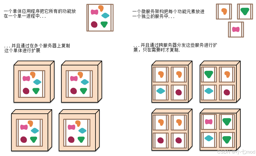 单体项目和微服务项目的对比图(这个图左半边的竖列是单体项目示意图,右半边的竖列是微服务架构的示意图):