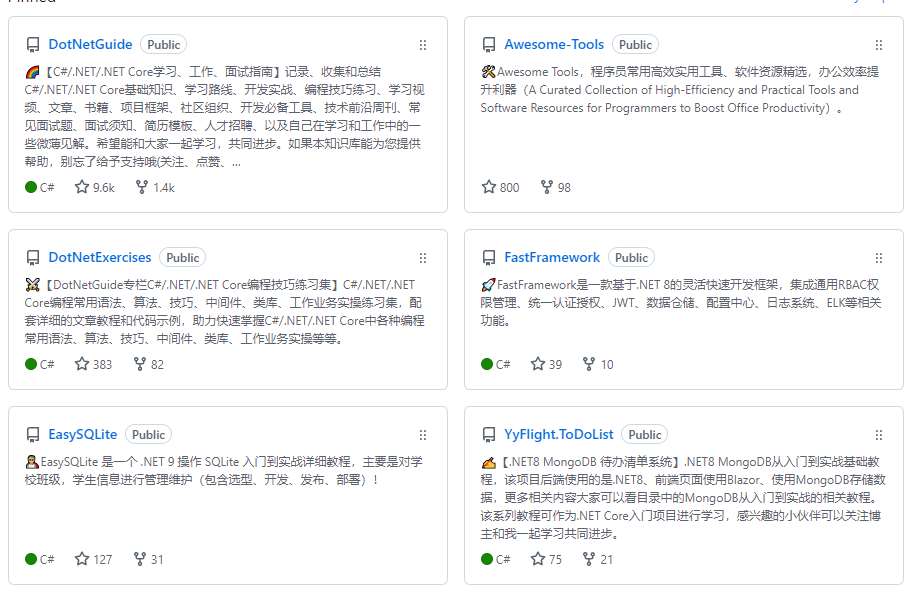 文章简介: DotNetGuide是一个专注于C#/.NET/.NET Core学习、工作、面试指南的 GitHub 知识库,该知识库记录、收集和总结了C#/.NET/.NET Core基础知识、学习路线、开发实战、编程技巧练习、学习视频、文章、书籍、项目框架、社区组织、开发必备工具、技术前沿周刊、常见面试题、面试须知、简历模板、人才招聘、以及自己在学习和工作中的一些微薄见解。