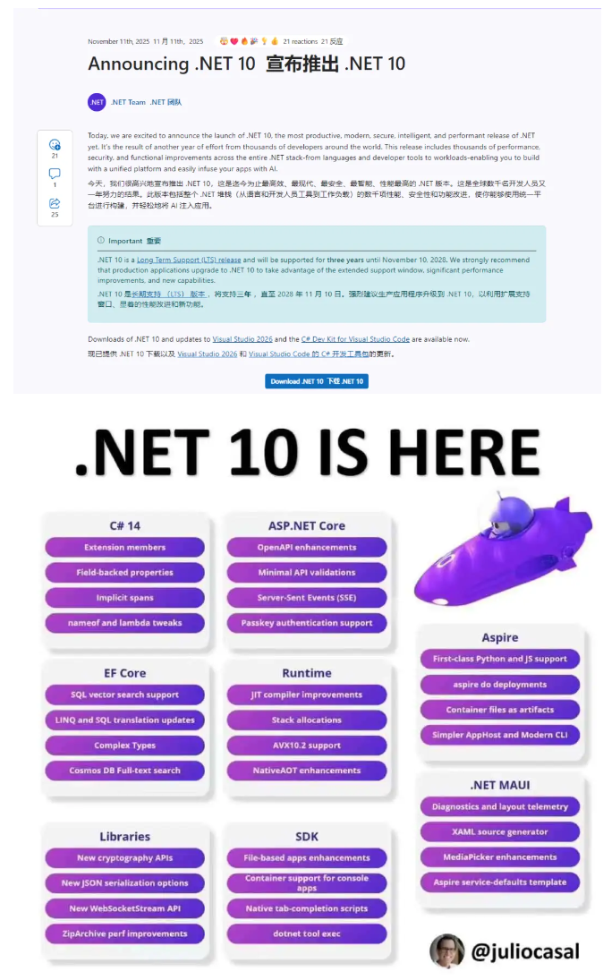 文章简介: 好消息,.NET 团队于 2025 11 月 11 日宣布 .NET 10 正式发布,这是迄今为止最高效、最现代、最安全、最智能且性能最高的 .NET 版本。