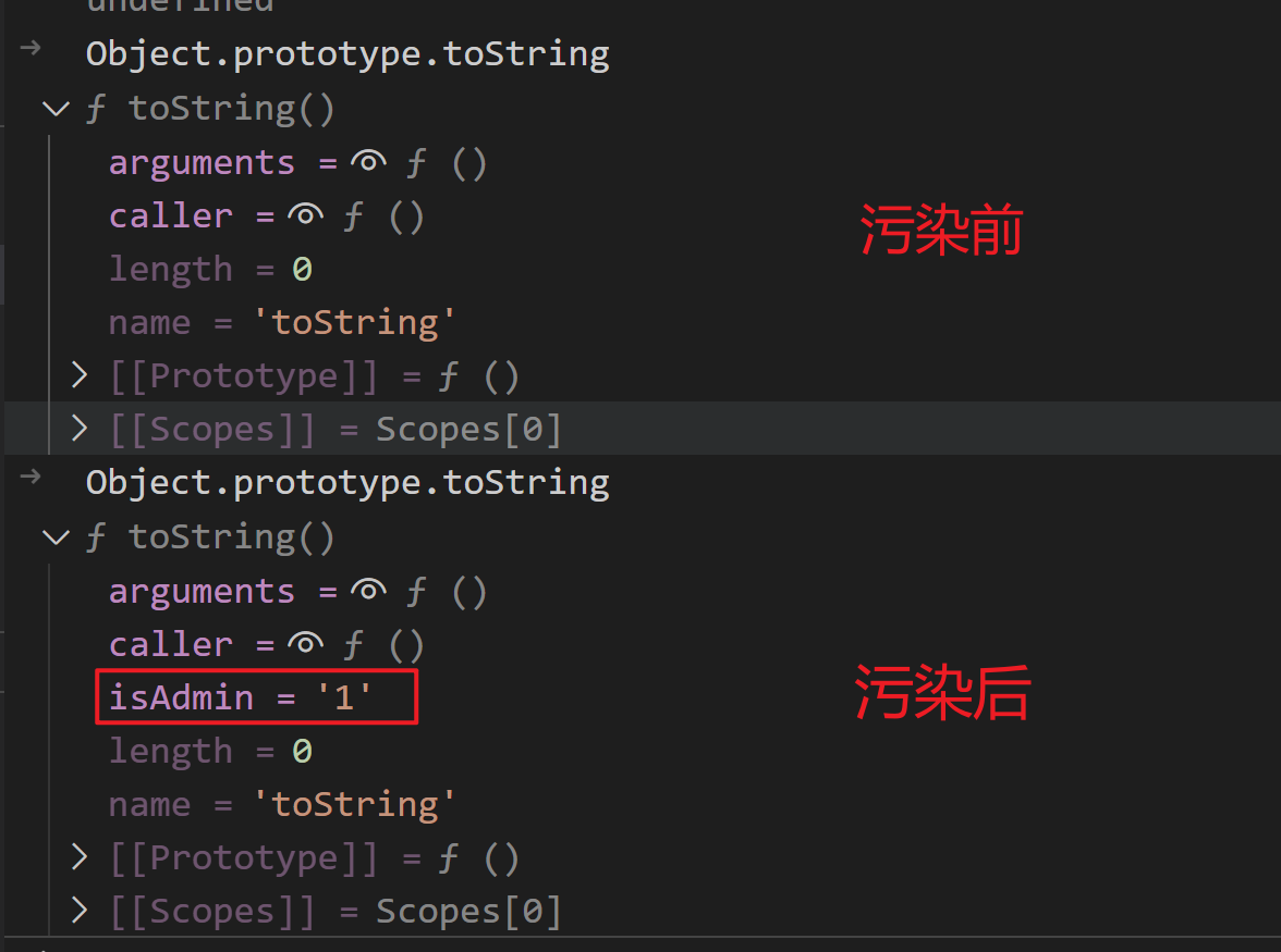 随后调用 deepMerge 函数合并对象时,会将 { isAdmin: "1" } 合并到 Object.prototype.toString 上,导致所有对象的 toString.isAdmin 被污染。下图是污染前后 的toString ,可以看到污染后的 toString 多了 isAdmin 属性,且值为1: