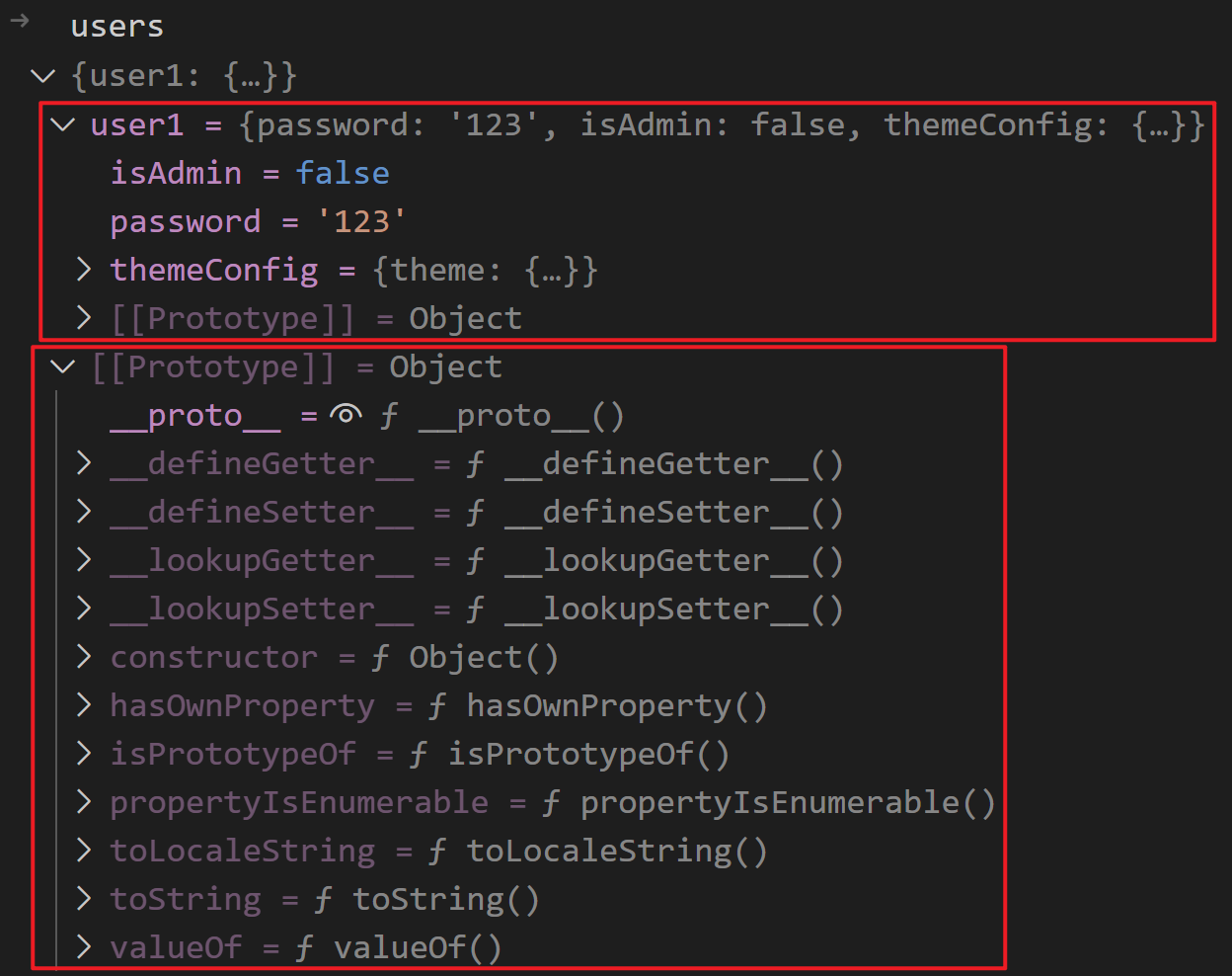 故users 除了自身的属性:user1 之外;还有继承自原型(即 Object)的属性,如 constructor,hasOwnProperty,isPrototypeOf 和 toString 等