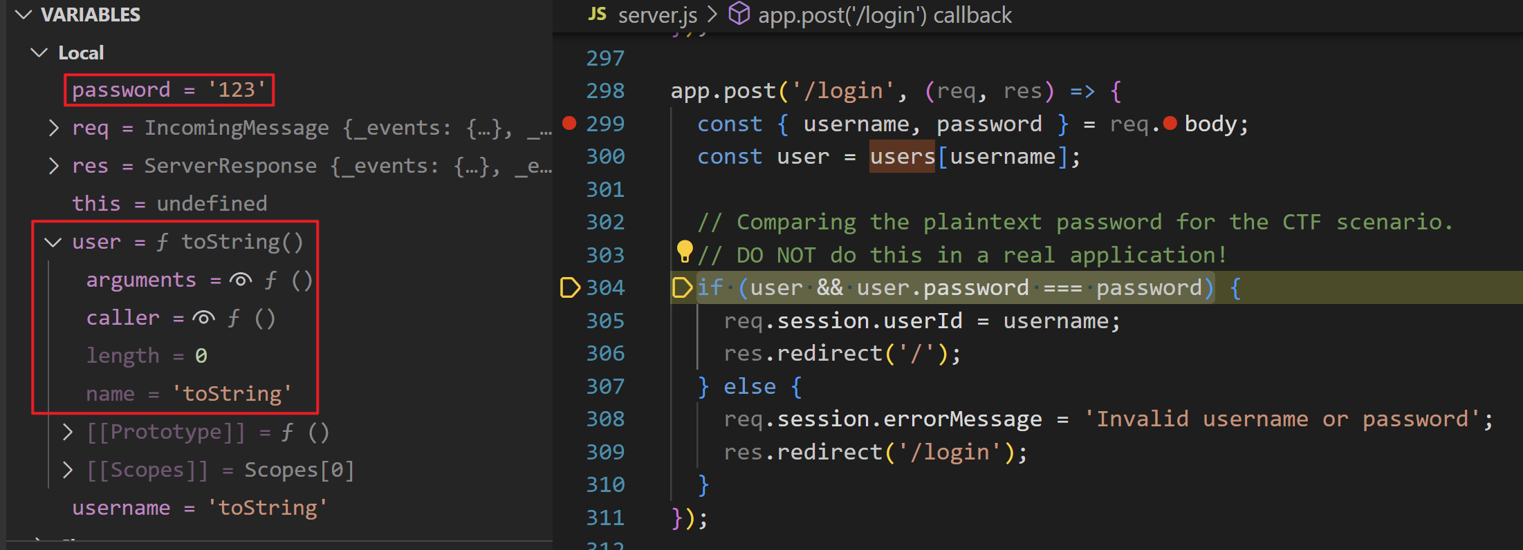 故要想通过304行的检查,将变量 password 的值设置为 undefined 即可。这样就可以绕过认证,以用户名 toString 成功登录系统。