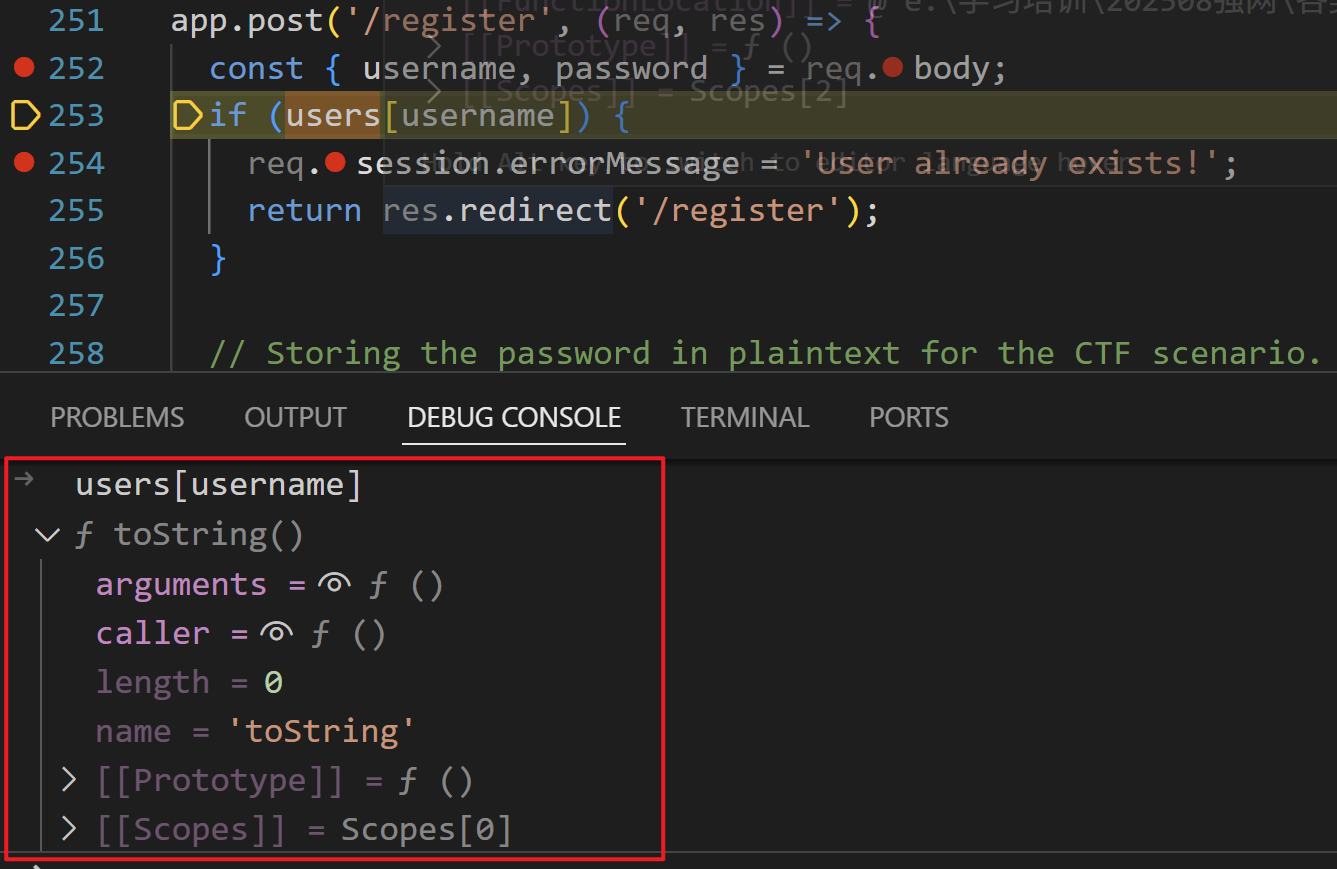 如前所述,users 的原型为 Object 。当 username 为 toString时,因为users自身不包含 toString 属性,故users[username] 返回的是users.__proto__.toString 即Object.toString 方法。如下: