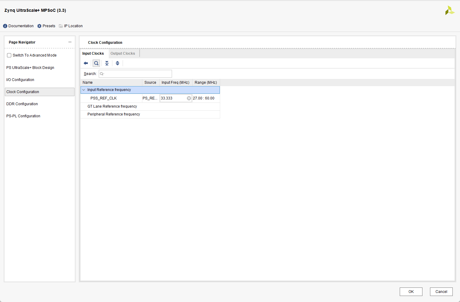 PS_REF,输入频率33.333MHz,工作范围27.00~60.00MHz。它是 APU、RPU、外设等模块时钟的 "母钟",通过 PLL 倍频 / 分频生成各类输出时钟。