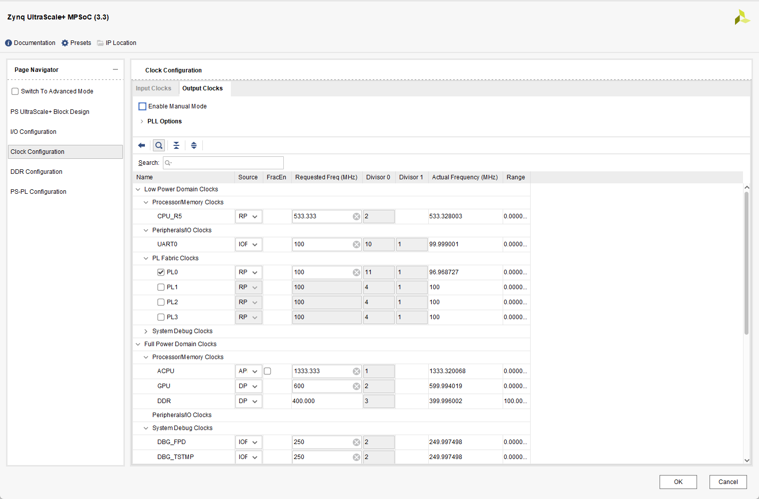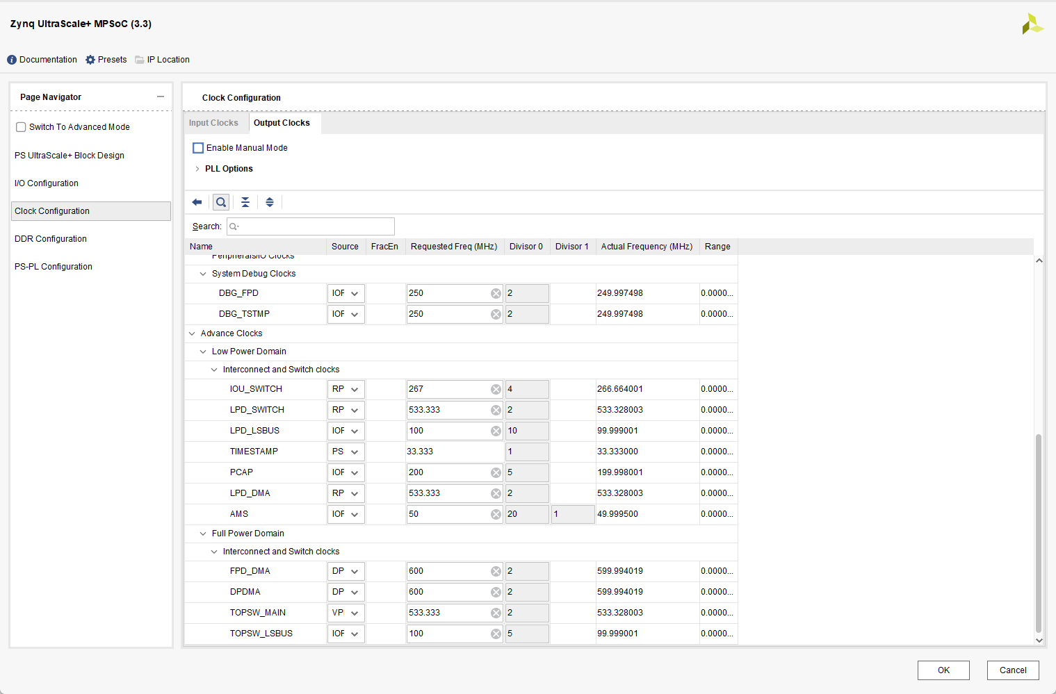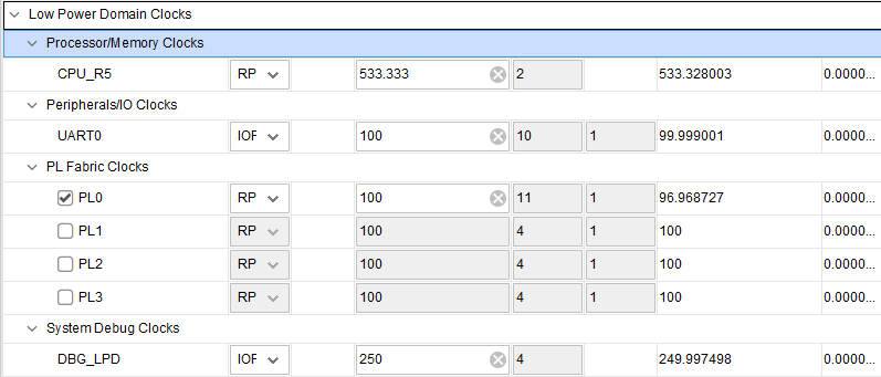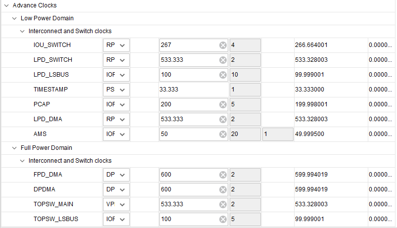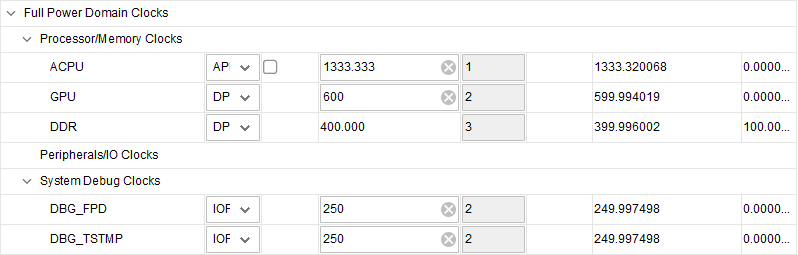 输出时钟通过 PLL 对输入时钟进行倍频、分频,为不同功能模块(APU、RPU、GPU、外设、PL 等)生成差异化时钟,同时兼顾性能、功耗、时序约束的平衡。配置界面按电源域和功能模块分层组织: