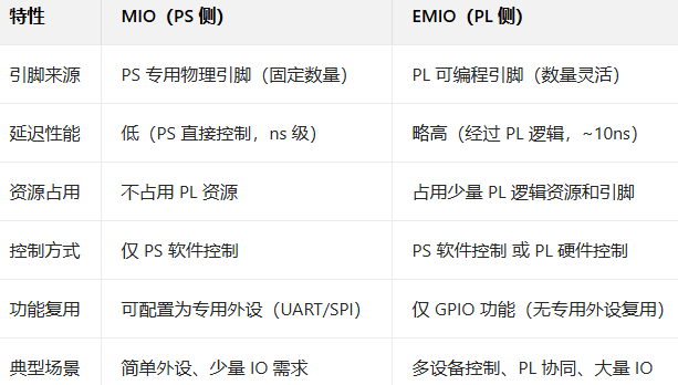 - 直接连接 PS 内部的 GPIO 控制器,无需经过 PL 逻辑,延迟极低(ns 级),且不占用 PL 的可编程资源(LUT/FF)和引脚。
