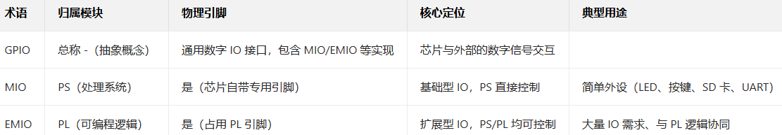 - 归属 :属于 ZYNQ 的 PS(Processing System,即 APU/RPU 所在的处理系统)模块,是 PS 自带的「专用物理 GPIO 引脚」。