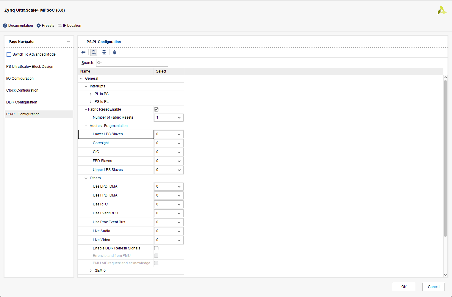 - Lower LPS Slaves、Coresight、GIC、FPD Slaves 等 :配置 PS 可访问的 PL 内 AXI 从设备数量,对应不同 功耗域(LPS 低功耗、FPD 全功耗) 和功能模块(调试、中断控制器等)。