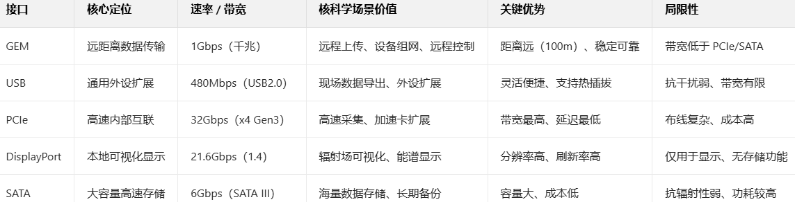 - 本质:高速数字显示接口,用于核数据的可视化输出(如辐射剂量热力图、γ 能谱曲线),支持高分辨率(4K@60Hz)、高刷新率,基于 DisplayPort 1.2/1.4 协议。
