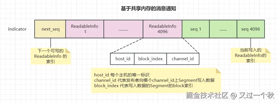 极端情况。虽然是一圈一圈的获取的readableinfo,如果写者太多了,则存在多个写者同时写入同一块的readableinfo的情况(可能存在复写的情况)。相应,每个读者都有自己记录独立的 next_seq_(表示自己下一块读的seq数组下标,只要检测到seq对应数组数值更大,就说明 readableinfo 有新的通知数据,获取 readableinfo 检查是否相关,进行下一步处理)- 为了解决上述问题,主要是由于