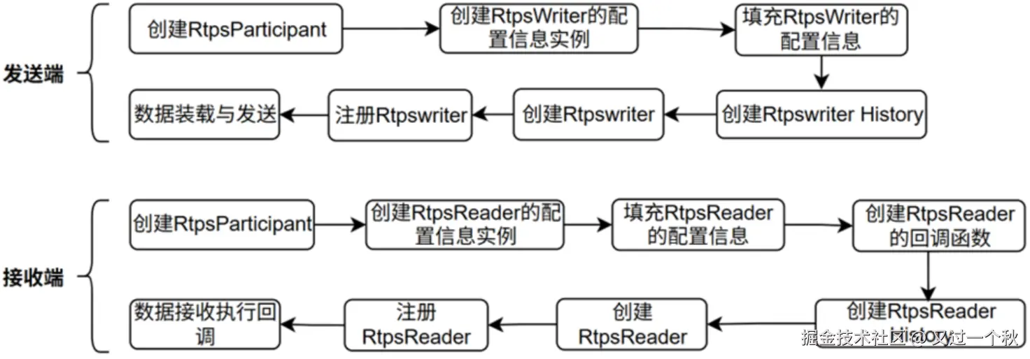 在接收端,同样需要先创建RtpsParticipant,然后创建RtpsReader的配置信息实例并填充相关信息,创建RtpsReader并为其设置回调函数,再创建RtpsReaderHistory,完成这些步骤后,就能在接收到数据时执行回调操作。当发送端和接收端都按照上述流程配置完成双方即可开始通信。